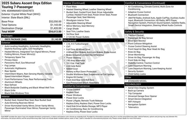 Certified. Crystal White Pearl 2025 Subaru Ascent Onyx Edition Touring AWD 2.4L 4-Cylinder DOHC 16V Lineartronic CVT