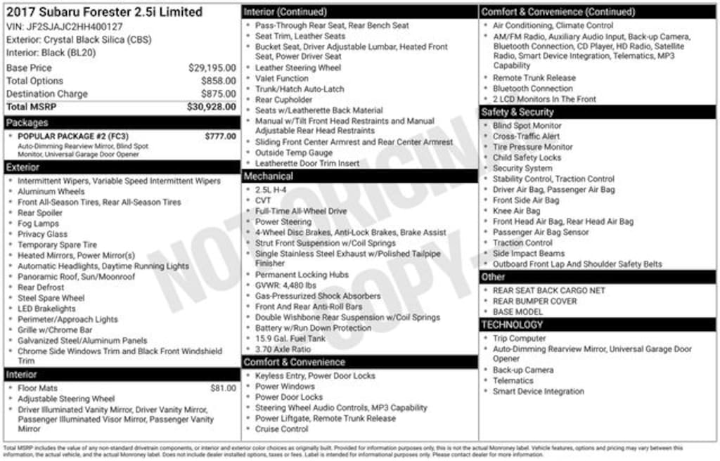 Crystal Black Silica 2017 Subaru Forester 2.5i Limited AWD 2.5L 4-Cylinder DOHC 16V VVT Lineartronic CVT